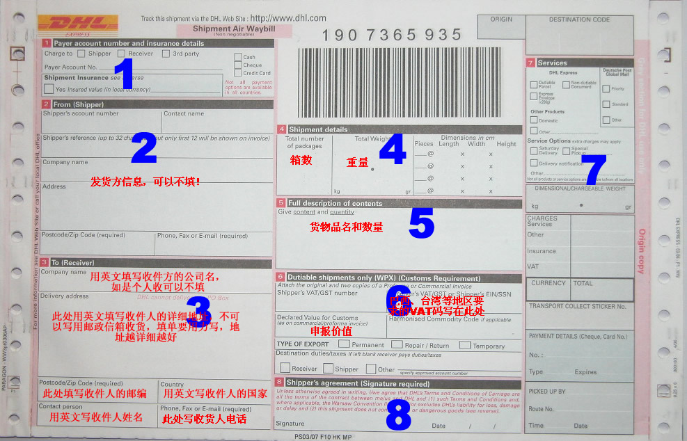 您如將一票快件交給DHL發運,需要填寫一份DHL運單。該運單是確保您的快件得以派送的機票和護照。