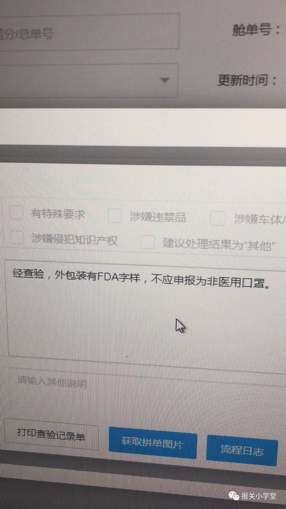 這份疑似海關查驗IPAD拍照的圖片,透露出海關還是認為標有FDA就不能報非醫用口罩。僅供各位工廠參考。